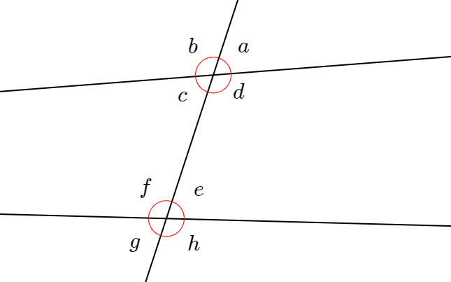 두 직선에 다른 한 직선이 만나서 이루는 각들 가운데 같은 위치에 있는 각을 동위각(corresponding angle)이라고 한다. a와 e, b와 f, c와 g, d와 h는 각각 서로 동위각이다.