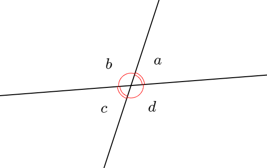 두 직선이 만나면 각이 4개 만들어진다. 이를 교각(angle of intersection)이라고 한다. 포물선이나 원 등의 곡선이 만나서 생기는 교각은 교점을 지나는 접선이 이루는 각으로 정의한다.