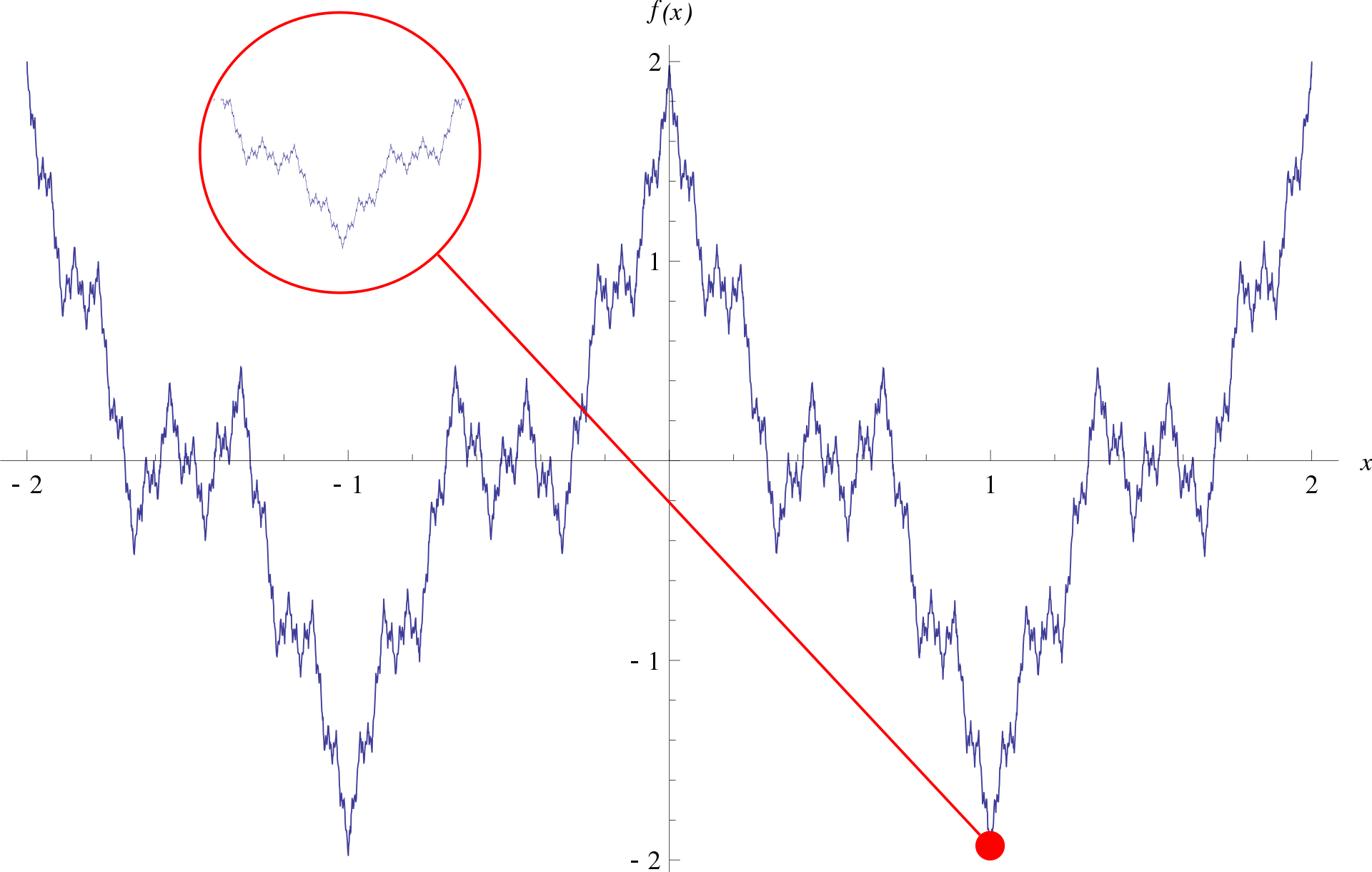 From Wikipedia, the free encyclopedia Function that is continuous everywhere but differentiable nowhere Plot of Weierstrass function over the interval [−2, 2]. Like some other fractals, the function exhibits self-similarity: every zoom (red circle) is s
