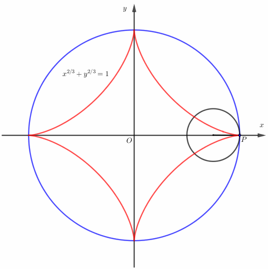 반지름이 $1$인 원 안에 반지름이 $\displaystyle{\frac{1}{4}}$인 원이 내접하고 있다고 하자. 아래와 같이 내접하는 원을 굴릴 때 처음에 접점이었던 점이 그리는 자취가 바로 아스트로이드이다. 이 곡선은 하이포사이클로이드 가운데 하나이다.